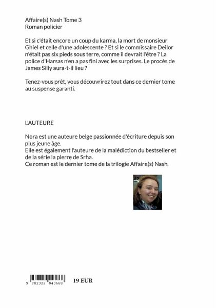Affaire(s) Nash Tome 3Roman policierEt si c'était encore un coup du karma, la mort de monsieur Ghiel et celle d'une adolescente ? Et si le commissaire Deilor n'était pas six pieds sous terre, comme il devrait l'être ? La police d'Harsas n'en a pas fini avec les surprises. Le procès aura-t-il lieu ?Tenez-vous prêt, vous découvrirez tout dans ce dernier tome au suspense garanti.