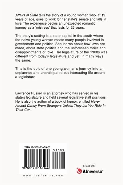 Affairs of State tells the story of a young woman who, at 19 years of age, goes to work for her state's senate and falls in love. The experience begins an unexpected romantic journey as a "mistress" that lasts for 25 years. The story's setting is a state capitol in the south where the naive young woman meets many people involved in government and politics. She learns about how laws are made, about state politics and the unforeseen thrills and disappointments of love. The legislature of the 1960s was different from today's legislature and yet, in many ways the same. This is the epic of one young woman's journey into an unplanned and unanticipated but interesting life around a legislature.