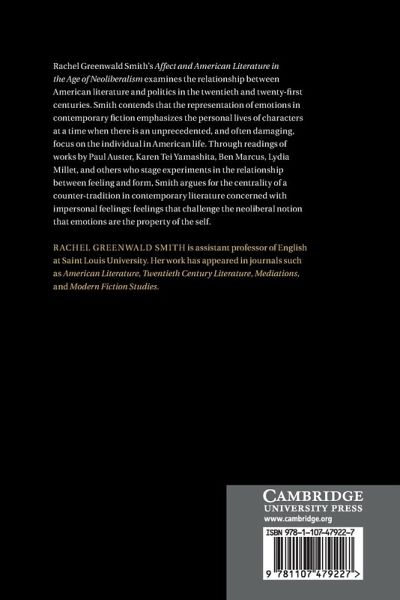 Rachel Greenwald Smith's Affect and American Literature in the Age of Neoliberalism examines the relationship between contemporary American literature and politics. Through readings of works by Paul Auster, Karen Tei Yamashita and others, Smith challenges the neoliberal notion that emotions are the property of the self.