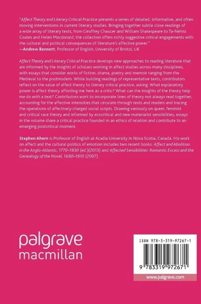 Affect Theory and Literary Critical Practice develops new approaches to reading literature that are informed by the insights of scholars working in affect studies across many disciplines, with essays that consider works of fiction, drama, poetry and memoir ranging from the medieval to the postmodern. While building readings of representative texts, contributors reflect on the value of affect theory to literary critical practice, asking: what explanatory power is affect theory affording me here as a critic? what can the insights of the theory help me do with a text? Contributors work to incorporate lines of theory not always read together, accounting for the affective intensities that circulate through texts and readers and tracing the operations of affectively charged social scripts. Drawing variously on queer, feminist and critical race theory and informed by ecocritical and new materialist sensibilities, essays in the volume share a critical practice founded in an ethics of relation and contribute to an emerging postcritical moment.