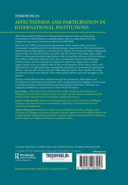 Since the early 2000s, international organisations within various policy areas have increasingly recognised and involved affected persons' organisations. This has promised to address long-standing legitimacy and democracy deficits of international policy making and norm setting. Yet, the powerful do not easily cede the terrain: Some major states, classic NGOs, and intergovernmental organisations seek to curtail the influence of the newcomers. The authors within this collection study these contestations from an interdisciplinary political science and international law perspective. Based on evidence from a broad range of policy areas, we address some of the crucial questions: What does it mean to be affected? How can affected groups meaningfully participate in international negotiations? Whose voices do still remain excluded? Ultimately, the authors chart whether the rising involvement of the 'most affected' will re-shape global politics and social struggles on the ground.