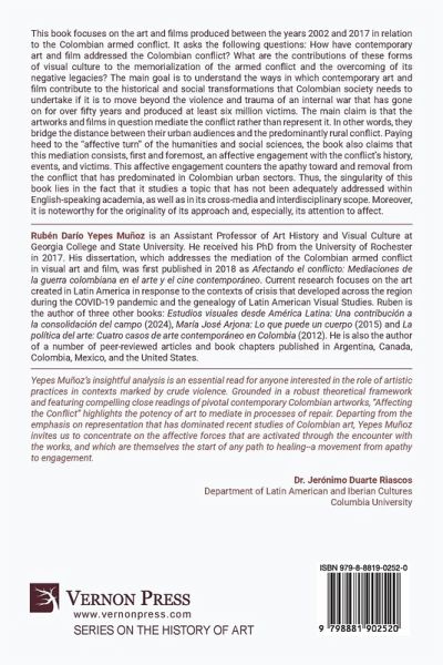 This book focuses on the art and films produced between the years 2002 and 2017 in relation to the Colombian armed conflict. It asks the following questions: How have contemporary art and film addressed the Colombian conflict? What are the contributions of these forms of visual culture to the memorialization of the armed conflict and the overcoming of its negative legacies? The main goal is to understand the ways in which contemporary art and film contribute to the historical and social transformations that Colombian society needs to undertake if it is to move beyond the violence and trauma of an internal war that has gone on for over fifty years and produced at least six million victims. The main claim is that the artworks and films in question mediate the conflict rather than represent it. In other words, they bridge the distance between their urban audiences and the predominantly rural conflict. Paying heed to the "affective turn" of the humanities and social sciences, the book also claims that this mediation consists, first and foremost, an affective engagement with the conflict's history, events, and victims. This affective engagement counters the apathy toward and removal from the conflict that has predominated in Colombian urban sectors. Thus, the singularity of this book lies in the fact that it studies a topic that has not been adequately addressed within English-speaking academia, as well as in its cross-media and interdisciplinary scope. Moreover, it is noteworthy for the originality of its approach and, especially, its attention to affect.