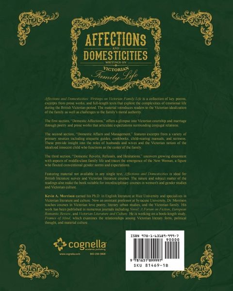 Affections and Domesticities: Writings on Victorian Family Life is a collection of key poems, excerpts from prose works, and full-length texts that explore the complexities of emotional life during the British Victorian period. The material introduces readers to the Victorian idealization of the family as well as challenges to the family's moral authority. The first section, “Domestic Affections,” offers a glimpse into Victorian courtship and marriage through poetry and prose works that articulate expectations surrounding conjugal relations. The second section, “Domestic Affairs and Management,” features excerpts from a variety of primary sources including etiquette guides, cookbooks, child-rearing manuals, and sermons. These provide insight into the roles of husbands and wives and the Victorian notion of the idealized innocent child who functions as the center of the family. The third section, “Domestic Revolts, Refusals, and Hesitations,” uncovers growing discontent with aspects of middle-class family life and traces the emergence of the New Woman, a figure who flouted conventional gender norms and expectations. Featuring material not available in any single text, Affections and Domesticities is ideal for British literature survey and Victorian literature courses. The nature and subject matter of the readings also make the book suitable for interdisciplinary courses in women's and gender studies and Victorian culture.