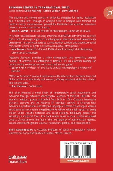 By arguing that activism is a performative and affective language that is defined by intersectional hopes, desires and dreams, as much as it engages with legal battles that define who or what might appear as being broken under specific historical and social settings, Affective Activisms employs gender and sexuality as analytical tools to make sense of local and transnational politics of resistance in the face of the re-emergence of authoritarian regimes, sexual harassment, gender violence, homo/trans phobia, and Islamophobia in Turkeyand worldwide. It will be of interest to students and scholars across the fields of women's, gender and sexuality studies, queer theory, critical human rights and political theory, sociology, and social anthropology.