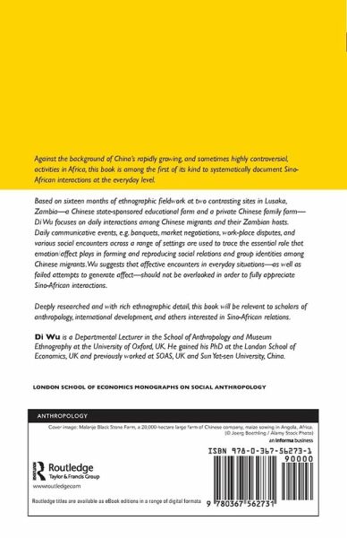 Based on sixteen months of ethnographic fieldwork at two contrasting sites in Lusaka, Zambia-a Chinese state-sponsored educational farm and a private Chinese family farm-Di Wu focuses on daily interactions among Chinese migrants and their Zambian hosts. Daily communicative events, e.g. banquets, market negotiations, work-place disputes, and various social encounters across a range of settings are used to trace the essential role that emotion/affect plays in forming and reproducing social relations and group identities among Chinese migrants. Wu suggests that affective encounters in everyday situations-as well as failed attempts to generate affect-should not be overlooked in order to fully appreciate Sino-African interactions.