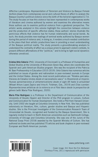 Affective Landscapes: Representation of Terrorism and Violence by Basque Female Authors draws from contemporary social and cultural theory of affect to analyze the Basque Country's political violence since the birth of the terrorist organization E.T.A. The study focuses on how this violence has been represented in contemporary works of literature and cinema authored by women and examines the alternative means these authors use to examine political violence from a gendered perspective. The artistic works analyzed in this volume highlight the connection between violence and the production of specific affective states; these authors' stories illustrate the pernicious effects that violence has for human relationality and social bonds. As such, the study provides new readings of seminal works authored by Basque women during this period of violence and, in doing so, it renders a much-needed contribution to the place that their artistic productions have in providing a novel understanding of the Basque political reality. The study presents a groundbreaking analysis to understand the centrality of affect as a unique prism to approach violent contexts, to present different affirmations of the "political," and to bring to light social dynamics otherwise unnoticed.