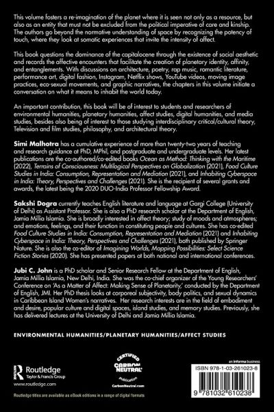 Simi Malhotra has a cumulative experience of more than twenty-two years of teaching and research guidance at PhD, MPhil, and postgraduate and undergraduate levels. Her latest publications are the co-authored/co-edited books Ocean as Method: Thinking with the Maritime (2022), Terrains of Consciousness: Multilogical Perspectives on Globalization (2021), Food Culture Studies in India: Consumption, Representation and Mediation ( 2021), and Inhabiting Cyberspace in India: Theory, Perspectives and Challenges (2021). She is the recipient of several grants and awards, the latest being the 2020 DUO-India Professor Fellowship Award. Sakshi Dogra currently teaches English literature and language at Gargi College (University of Delhi) as Assistant Professor. She is also a PhD research scholar at the Department of English, Jamia Millia Islamia. She is broadly interested in affect theory; study of moods and atmospheres; and emotions, feelings, and their function in constituting people and cultures. She has co-edited Food Culture Studies in India: Consumption, Representation and Mediation (2021) and Inhabiting Cyberspace in India: Theory, Perspectives and Challenges (2021), both published by Springer Nature. She is also the co-editor of Imagining Worlds, Mapping Possibilities: Select Science Fiction Stories (2020). She has presented papers at both national and international conferences. Jubi C. John is a PhD scholar and Senior Research Fellow at the Department of English, Jamia Millia Islamia, New Delhi, India. She was the co-chief organizer of the Young Researchers' Conference on 'As a Matter of Affect: Making Sense of Planetarity,' conducted by the Department of English, JMI. Her PhD thesis looks at corporeal subjectivity, body politics, and sexual dynamics in Caribbean Island Women's narratives. Her research interests are in the field of embodiment and desire, popular culture and digital spaces, island studies, and memory studies. Previously, she has delivered lectures at the University of Delhi and Jamia Millia Islamia.