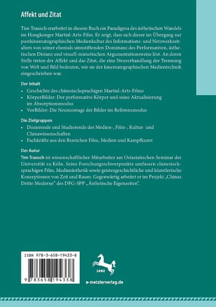 Tim Trausch erarbeitet in diesem Buch ein Paradigma des ästhetischen Wandels im Hongkonger Martial-Arts-Film. Er zeigt, dass sich dieser im Übergang zur postkinematographischen Medienkultur des Informations- und Netzwerkzeitalters von seiner ehemals sinnstiftenden Dominanz des Performativen, ästhetischen Distanz und visuell-mimetischen Argumentationsweise löst. An deren Stelle treten der Affekt und das Zitat, die eine Neuverhandlung der Trennung von Welt und Bild bedeuten, wie sie der kinematographischen Medientechnik eingeschrieben war.