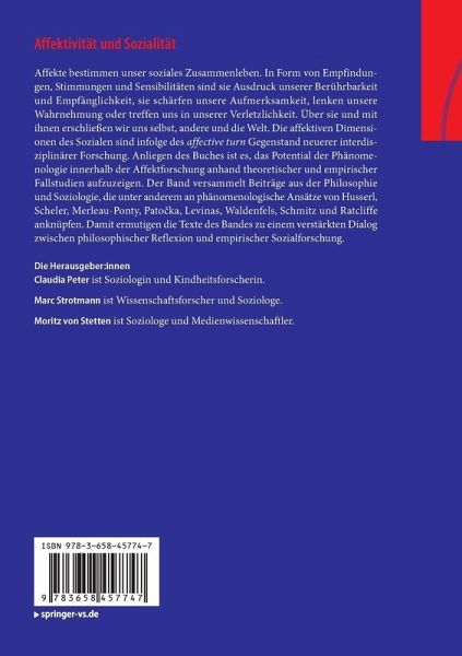 Affekte bestimmen unser soziales Zusammenleben. In Form von Empfindungen, Stimmungen und Sensibilitäten sind sie Ausdruck unserer Berührbarkeit und Empfänglichkeit, sie schärfen unsere Aufmerksamkeit, lenken unsere Wahrnehmung oder treffen uns in unserer Verletzlichkeit. Über sie und mit ihnen erschließen wir uns selbst, andere und die Welt. Die affektiven Dimensionen des Sozialen sind infolge des affective turn Gegenstand neuerer interdisziplinärer Forschung. Anliegen des Buches ist es, das Potential der Phänomenologie innerhalb der Affektforschung anhand theoretischer und empirischer Fallstudien aufzuzeigen. Der Band versammelt Beiträge aus der Philosophie und Soziologie, die unter anderem an phänomenologische Ansätze von Husserl, Scheler, Merleau-Ponty, Patocka, Levinas, Waldenfels, Schmitz und Ratcliffe anknüpfen. Damit ermutigen die Texte des Bandes zu einem verstärkten Dialog zwischen philosophischer Reflexion und empirischer Sozialforschung.