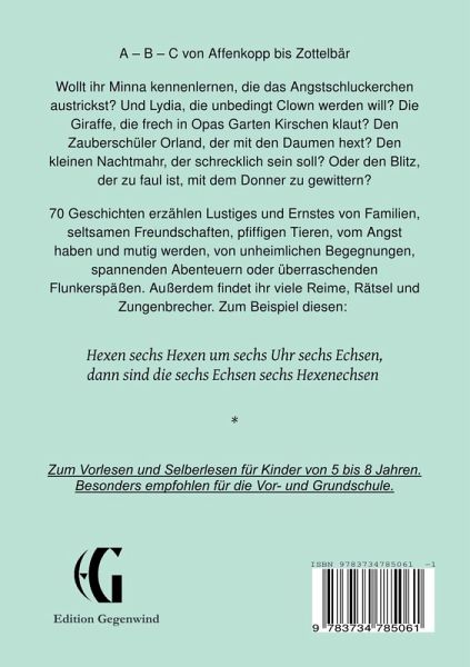 A - B - C von Affenkopp bis ZottelbärWollt ihr Minna kennenlernen, die das Angstschluckerchen austrickst? Und Lydia, die unbedingt Clown werden will? Die Giraffe, die frech in Opas Garten Kirschen klaut? Den Zauberschüler Orland, der mit den Daumen hext? Den kleinen Nachtmahr, der schrecklich sein soll? Oder den Blitz, der zu faul ist, mit dem Donner zu gewittern?70 Geschichten erzählen Lustiges und Ernstes von Familien, seltsamen Freundschaften, pfiffigen Tieren, vom Angst haben und mutig werden, von unheimlichen Begegnungen, spannenden Abenteuern oder überraschenden Flunkerspäßen. Außerdem findet ihr viele Reime, Rätsel und Zungenbrecher. Zum Beispiel diesen: Hexen sechs Hexen um sechs Uhr sechs Echsen,dann sind die sechs Echsen sechs Hexenechsen Zum Vorlesen und Selberlesen für Kinder von 5 bis 8 Jahren.Besonders empfohlen für die Vor- und Grundschule