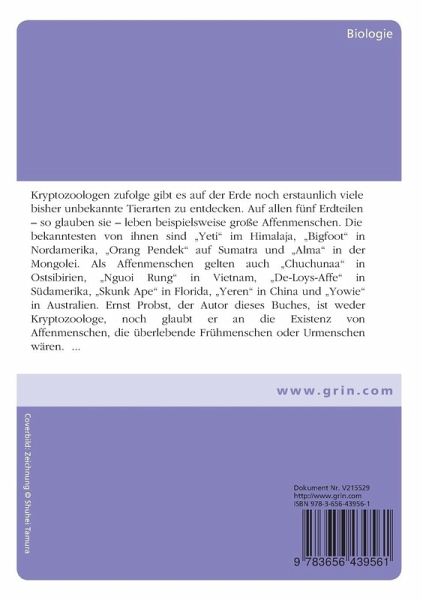 Fachbuch aus dem Jahr 2013 im Fachbereich Biologie - Zoologie, , Sprache: Deutsch, Abstract: Kryptozoologen zufolge gibt es auf der Erde noch erstaunlich viele bisher unbekannte Tierarten zu entdecken. Auf allen fünf Erdteilen - so glauben sie - leben beispielsweise große Affenmenschen. Die bekanntesten von ihnen sind "Yeti" im Himalaja, "Bigfoot" in Nordamerika, "Orang Pendek" auf Sumatra und "Alma" in der Mongolei. Als Affenmenschen gelten auch "Chuchunaa" in Ostsibirien, "Nguoi Rung" in Vietnam, "De-Loys-Affe" in Südamerika, "Skunk Ape" in Florida, "Yeren" in China und "Yowie" in…mehr