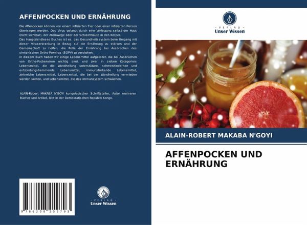 Die Affenpocken können von einem infizierten Tier oder einer infizierten Person übertragen werden. Das Virus gelangt durch eine Verletzung selbst der Haut (nicht sichtbar), der Atemwege oder der Schleimhäute in den Körper.Das Hauptziel dieses Buches ist es, das Gesundheitssystem beim Umgang mit dieser Viruserkrankung in Bezug auf die Ernährung zu stärken und der Gemeinschaft zu helfen, die Rolle der Ernährung bei Ausbrüchen des simianischen Ortho-Poxvirus (SOPV) zu verstehen.In diesem Buch haben wir einige Lebensmittel aufgelistet, die bei Ausbrüchen von Ortho-Pockenviren wichtig sind, und zwar in sieben Kategorien: Lebensmittel, die die Wundheilung unterstützen, schmerzlindernde und entzündungshemmende Lebensmittel, immunstärkende Lebensmittel, zinkreiche Lebensmittel, Lebensmittel, die bei der Wundheilung vermieden werden sollten, und Lebensmittel, die das Immunsystem schwächen.