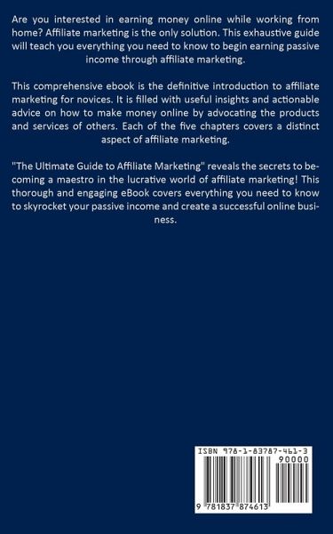 Are you interested in earning money online while working from home? Affiliate marketing is the only solution. This exhaustive guide will teach you everything you need to know to begin earning passive income through affiliate marketing. This comprehensive paperback is the definitive introduction to affiliate marketing for novices. It is filled with useful insights and actionable advice on how to make money online by advocating the products and services of others. Each of the five chapters covers a distinct aspect of affiliate marketing. "The Ultimate Guide to Affiliate Marketing" reveals the secrets to becoming a maestro in the lucrative world of affiliate marketing! This thorough and engaging paperback covers everything you need to know to skyrocket your passive income and create a successful online business.