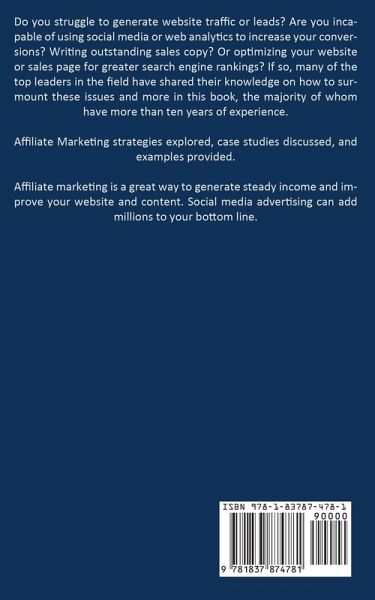 Do you struggle to generate website traffic or leads? Are you incapable of using social media or web analytics to increase your conversions? Writing outstanding sales copy? Or optimizing your website or sales page for greater search engine rankings? If so, many of the top leaders in the field have shared their knowledge on how to surmount these issues and more in this book, the majority of whom have more than ten years of experience. Affiliate Marketing strategies explored, case studies discussed, and examples provided. Affiliate marketing is a great way to generate steady income and improve your website and content. Social media advertising can add millions to your bottom line.