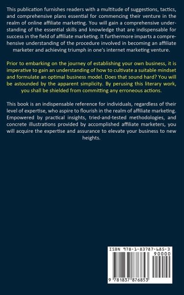 This publication furnishes readers with a multitude of suggestions, tactics, and comprehensive plans essential for commencing their venture in the realm of online affiliate marketing. You will gain a comprehensive understanding of the essential skills and knowledge that are indispensable for success in the field of affiliate marketing. It furthermore imparts a comprehensive understanding of the procedure involved in becoming an affiliate marketer and achieving triumph in one's internet marketing venture. Prior to embarking on the journey of establishing your own business, it is imperative to gain an understanding of how to cultivate a suitable mindset and formulate an optimal business model. Does that sound hard? You will be astounded by the apparent simplicity. By perusing this literary work, you shall be shielded from committing any erroneous actions. This book is an indispensable reference for individuals, regardless of their level of expertise, who aspire to flourish in the realm of affiliate marketing. Empowered by practical insights, tried-and-tested methodologies, and concrete illustrations provided by accomplished affiliate marketers, you will acquire the expertise and assurance to elevate your business to new heights.