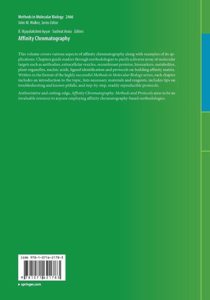 Antibody Purification Using Affinity Chromatography.- TIM4-affinity Methods Targeting Phosphatidylserine for Isolation or Detection of Extracellular Vesicles.- Application of Affitins for Affinity Purification of Proteins.- Identification of Clusterin as a major ABri- and ADan-binding protein using affinity Chromatography.- Application of a Novel CL7/Im7 Affinity System in Purification of Complex and Pharmaceutical Proteins.- Positive and Negative Affinity Chromatography to Purify Norovirus P-Domain Protein.- Robotic Affinity Purification of Soluble and Insoluble Recombinant Glutathione-S-Transferase Fusion Proteins.- Application of Immunoaffinity-Mass Spectrometry (IA-MS) for Protein Biomarker Quantification.- Cellular Membrane Affinity Chromatography for the Identification of Bioactive Molecules from Complex Natural Mixtures.- Rapid Affinity Purification of Tagged Plant Mitochondria (Mito-AP).- Arginine-affinity Chromatographyfor Nucleic Acids (DNA and RNA) Isolation.- Purification and Analysis of Nucleotides and Nucleosides from Plants.- Ligand Selection for Affinity Chromatography Using Phage Display.- Selection and Application of Aptamer Affinity for Protein Purification.- Entrapment of Proteins within Columns for High-Performance Affinity Chromatography.- Preparation of Affinity Chromatography Monolith in Miniaturized Format and Application for Protein Separation.- Ligand Immobilization Methods for Affinity Chromatography.- Preparation of Molecularly Imprinted poly(N-isopropylacrylamide) Thermosensitive Based Cryogels.- Preparation of Staphylococcal Protein a Imprinted Supermacroporous Cryogel Beads.