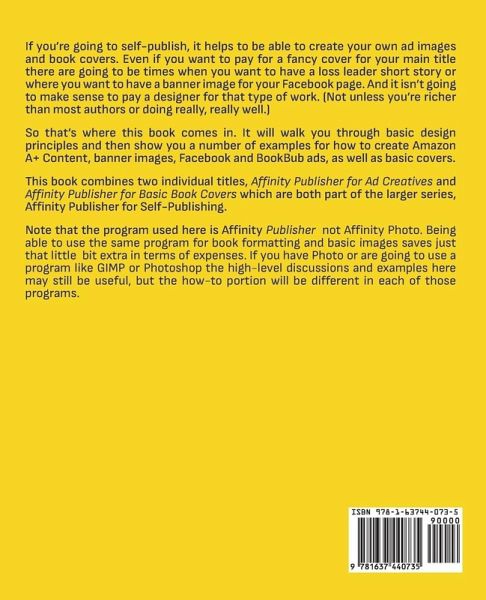 If you're going to self-publish, it helps to be able to create your own ad images and book covers. Even if you want to pay for a fancy cover for your main title there are going to be times when you want to have a loss leader short story or where you want to have a banner image for your Facebook page. And it isn't going to make sense to pay a designer for that type of work. (Not unless you're richer than most authors or doing really, really well.) So that's where this book comes in. It will walk you through basic design principles and then show you a number of examples for how to create Amazon A+ Content, banner images, Facebook and BookBub ads, as well as basic covers. This book combines two individual titles, Affinity Publisher for Ad Creatives and Affinity Publisher for Basic Book Covers which are both part of the larger series, Affinity Publisher for Self-Publishing. Note that the program used here is Affinity Publisher not Affinity Photo. Being able to use the same program for book formatting and basic images saves just that little bit extra in terms of expenses. If you have Photo or are going to use a program like GIMP or Photoshop the high-level discussions and examples here may still be useful, but the how-to portion will be different in each of those programs.