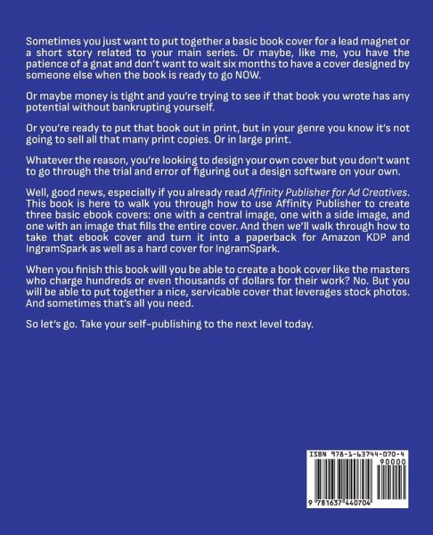 Sometimes you just want to put together a basic book cover for a lead magnet or a short story related to your main series. Or maybe, like me, you have the patience of a gnat and don't want to wait six months to have a cover designed by someone else when the book is ready to go NOW. Or maybe money is tight and you're trying to see if that book you wrote has any potential without bankrupting yourself. Or you're ready to put that book out in print, but in your genre you know it's not going to sell all that many print copies. Or in large print. Whatever the reason, you're looking to design your own cover but you don't want to go through the trial and error of figuring out a design software on your own. Well, good news, especially if you already read Affinity Publisher for Ad Creatives. This book is here to walk you through how to use Affinity Publisher to create three basic ebook covers: one with a central image, one with a side image, and one with an image that fills the entire cover. And then we'll walk through how to take that ebook cover and turn it into a paperback for Amazon KDP and IngramSpark as well as a hard cover for IngramSpark. When you finish this book will you be able to create a book cover like the masters who charge hundreds or even thousands of dollars for their work? No. But you will be able to put together a nice, servicable cover that leverages stock photos. And sometimes that's all you need. So let's go. Take your self-publishing to the next level today.