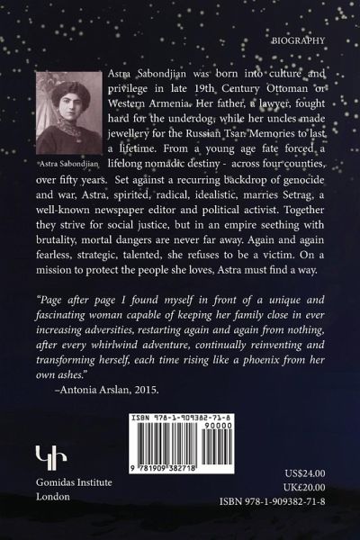 Astra Sabondjian was born into culture and privilege in late 19th century Ottoman or Western Armenia. Her father, a lawyer, fought hard for the underdog, while her uncles made jewellery for the Russian Tsar. Memories to last a lifetime. From a young age fate forced a lifelong nomadic destiny - across four counties, over fifty years. Set against a recurring backdrop of genocide and war, Astra, spirited, radical, idealistic, marries Setrag, a well-known newspaper editor and political activist. Together they strive for social justice, but in an empire seething with brutality, mortal dangers are never far away. Again and again fearless, strategic, talented, she refuses to be a victim. On a mission to protect the people she loves, Astra must find a way.
