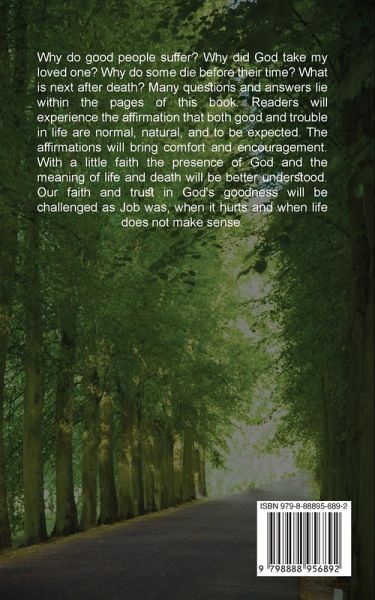 Why do good people suffer? Why did God take my loved one? Why do some die before their time? What is next after death? Many questions and answers lie within the pages of this book. Readers will experience the affirmation that both good and trouble in life are normal, natural, and to be expected. The affirmations will bring comfort and encouragement. With a little faith, the presence of God and the meaning of life and death will be better understood. Our faith and trust in God's goodness will be challenged as Job was, when it hurts and when life does not make sense. ¿The story and words of "The Book of Job" has brought encouragement and comfort to many throughout the ages. People put words to their grief, depression and dying by what they say, pray, and sing. Soul singer Sam Cooke used the words of Job to express deep pain, by singing; "It's been a long time coming but I know a change is going to come." (Job 14:14) Remember, "You don't have to worry, no, your burdens you won't bear alone. Even in your darkest night, God is sure to be your guiding light." (Song- "I must tell Jesus" By Elisha Hoffman)