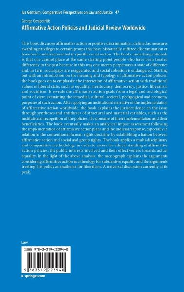 This book discusses affirmative action or positive discrimination, defined as measures awarding privileges to certain groups that have historically suffered discrimination or have been underrepresented in specific social sectors. The book's underlying rationale is that one cannot place at the same starting point people who have been treated differently in the past because in this way one merely perpetuates a state of difference and, in turn, social gaps are exaggerated and social cohesion is endangered. Starting out with an introduction on the meaning and typology of affirmative action policies, the book goes on to emphasise the interaction of affirmative action with traditional values of liberal state, such as equality, meritocracy, democracy, justice, liberalism and socialism. It reveals the affirmative action goals from a legal and sociological point of view, examining the remedial, cultural, societal, pedagogical and economy purposes of such action. After applying an institutional narrative of the implementation of affirmative action worldwide, the book explains the jurisprudence on the issue through syntheses and antitheses of structural and material variables, such as the institutional recognition of the policies, the domains of their implementation and their beneficiaries. The book eventually makes an analytical impact assessment following the implementation of affirmative action plans and the judicial response, especially in relation to the conventional human rights doctrine, by establishing a liaison between affirmative action and social and group rights.. The book applies a multi-disciplinary and comparative methodology in order to assess the ethical standing of affirmative action policies, the public interests involved and their effectiveness towards actual equality. In the light of the above analysis, the monograph explains the arguments considering affirmative action as a theology for substantive equality and the arguments treating thispolicy as anathema for liberalism. A universal discussion currently at its peak.