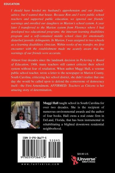 I should have heeded my husband's apprehension and our friends' advice, but I wanted that house. Because Ron and I were public school teachers and supported public education, we ignored our friends' warnings and enrolled our daughters in Marion's school system. A year later I transferred to the Marion system from Florence where I had developed two educational programs: the itinerant learning disabilities program and a self-contained middle school class for emotionally disturbed juvenile delinquents. In Marion, I was assigned to two schools as a learning disabilities clinician. Within weeks of my transfer, my first encounter with the establishment made me acutely aware that the warnings of our friends were accurate. Almost four decades since the landmark decision in Pickering v. Board of Education, 1968, many teachers still cannot criticize their school system without fear of retaliation. When author Maggi Hall, a veteran public school teacher, wrote a letter to the newspaper in Marion County, South Carolina, criticizing her school district, she didn't realize that one day she would be called upon to defend the cornerstone of democracy itself-the First Amendment. AFFIRMED: Teachers as Citizens is her amazing story of determination.