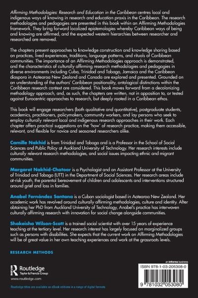 The chapters present approaches to knowledge construction and knowledge sharing based on practices, lived experiences, traditions, language patterns, and rituals of Caribbean communities. The importance of an Affirming Methodologies approach is demonstrated, and the characteristics of culturally affirming research methodologies and pedagogies in diverse environments including Cuba, Trinidad and Tobago, Jamaica and the Caribbean diaspora in Aotearoa New Zealand and Canada are explored and presented. Grounded on an understanding of the authors' Caribbean positionality, ontological distinctions within the Caribbean research context are considered. This book moves forward from a decolonizing methodology approach, and, as such, the chapters are written, not in opposition to, or tested against Eurocentric approaches to research, but deeply rooted in a Caribbean ethos.