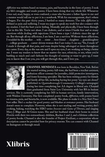 Affliction was written based on trauma, pain, and heartache in the form of poetry. I took my life's struggles and made poems. I have been doing that my whole life. Whenever I was sad, mad, happy, or even confused, a man who became a father figure to me and a mentor would tell me to put it in a notebook. With his encouragement, that's where it began. For the past thirty years, I battled so many demons. The title Affliction is defined as pain and suffering. I want my pages to speak my truth but also connect with my readers. I feel the hurt you're feeling. Mentally and physically, I have been through a lot in this life. You're not alone. I am diabetic, and at times I battle fear and so many emotions while dealing with injections. I have been a type 1 diabetic since the age of six. But through all my afflictions, I am here, I am a survivor. Without those afflictions, I wouldn't be the mother . . . wife . . . sister . . . best friend . . . daughter . . . granddaughter . . . college graduate . . . career-driven woman that I am today. I can say, "Yes, I made it!" I made it through all that pain, and even despite being sabotaged at times throughout my career. Every day, as the sun sets and I open my eyes, I am working on being a better me. I want my readers to know that no matter the race, ethnicity, or sex, when you're battling so much and can't fathom the thought of existing or want to give up, I want you to know that I see you, you will get through this, and I love you.