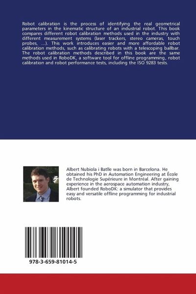 Robot calibration is the process of identifying the real geometrical parameters in the kinematic structure of an industrial robot. This book compares different robot calibration methods used in the industry with different measurement systems (laser trackers, stereo cameras, touch probes, ...). This work introduces easier and more affordable robot calibration methods, such as calibrating robots with a telescoping ballbar. The robot calibration methods described in this book are the same methods used in RoboDK, a software tool for offline programming, robot calibration and robot performance tests, including the ISO 9283 tests.