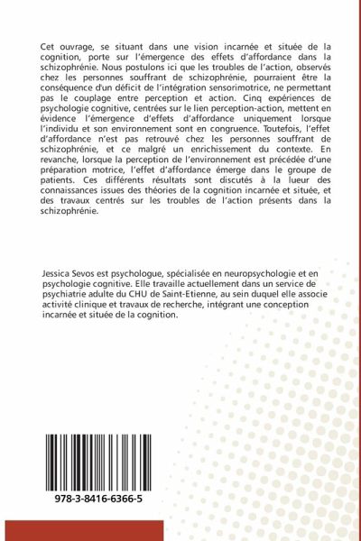 Cet ouvrage, se situant dans une vision incarnée et située de la cognition, porte sur l'émergence des effets d'affordance dans la schizophrénie. Nous postulons ici que les troubles de l'action, observés chez les personnes souffrant de schizophrénie, pourraient être la conséquence d'un déficit de l'intégration sensorimotrice, ne permettant pas le couplage entre perception et action. Cinq expériences de psychologie cognitive, centrées sur le lien perception-action, mettent en évidence l'émergence d'effets d'affordance uniquement lorsque l'individu et son environnement sont en congruence. Toutefois, l'effet d'affordance n'est pas retrouvé chez les personnes souffrant de schizophrénie, et ce malgré un enrichissement du contexte. En revanche, lorsque la perception de l'environnement est précédée d'une préparation motrice, l'effet d'affordance émerge dans le groupe de patients. Ces différents résultats sont discutés à la lueur des connaissances issues des théories de la cognition incarnée et située, et des travaux centrés sur les troubles de l'action présents dans la schizophrénie.