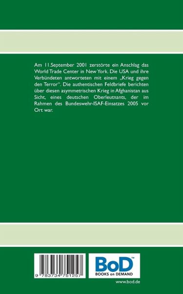 Am 11.September 2001 zerstörte ein Anschlag das World Trade Center in New York. Die USA und ihre Verbündeten antworteten mit einem "Krieg gegen den Terror". Die authentischen Feldbriefe berichten über diesen asymmetrischen Krieg in Afghanistan aus Sicht eines deutschen Oberleutnants, der im Rahmen des Bundeswehr-ISAF-Einsatzes 2005 vor Ort war.