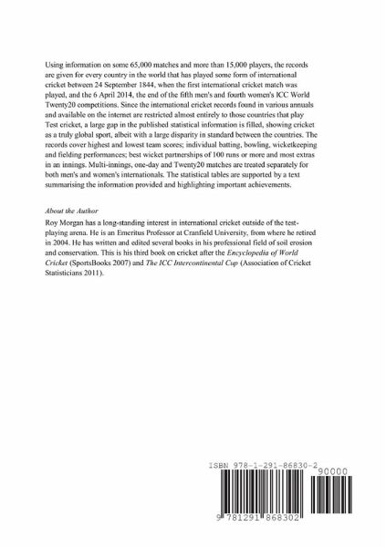 Using information on some 65,000 matches and more than 15,000 players, the records are given for every country in the world that has played some form of international cricket between 24 September 1844, the date of the first international match, and the 6 April 2014. Since the records found in various annuals and on the internet are restricted almost entirely to those countries that play Test cricket, a large gap in the published statistical information is filled, showing cricket as a truly global sport. The records cover highest and lowest team scores; individual batting, bowling, wicketkeeping and fielding performances; best wicket partnerships of 100 runs or more and most extras in an innings. Multi-innings, one-day and Twenty20 matches are treated separately for both men's and women's internationals. The statistical tables are supported by a text summarising the information provided and highlighting important achievements.
