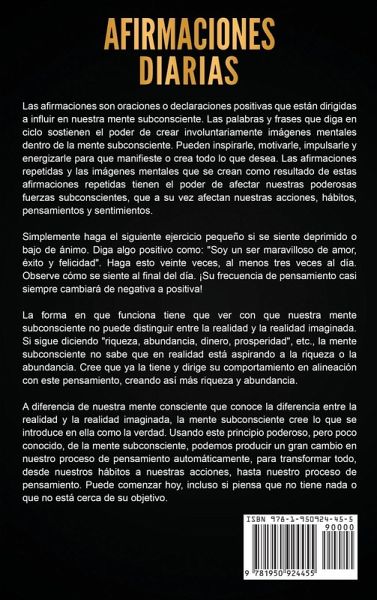 ¿Sabía que las personas optimistas tienen corazones más sanos? Las afirmaciones contenidas en este extraordinario libro están diseñadas para mantenerle motivado a lograr su objetivo. Afectarán a la mente subconsciente para activar sus poderes de cumplimiento. Estas afirmaciones tienen la capacidad de impactar la forma en que piensa y actúa cuando se comunica con personas que tienen la capacidad de ayudarle a lograr sus objetivos. Repetir estas afirmaciones positivas en ciclo le hace sentir más enérgico, activo y positivo, lo que a su vez le pone en un mejor estado de ánimo para transformar su realidad externa e interna. Los pensamientos de hecho se convierten en cosas, y las afirmaciones siembran las semillas de pensamientos positivos en su mente subconsciente. Afirmaciones diarias: 250 afirmaciones positivas para la salud, la riqueza, la felicidad y el amor incluyen: Cómo usar las afirmaciones: 10 reglas para crear afirmaciones perfectas Afirmaciones de riqueza, abundancia y prosperidad Afirmaciones para el amor Afirmaciones para la salud Afirmaciones para la felicidad ¡Obtenga este libro ahora para aprender más sobre las afirmaciones diarias!