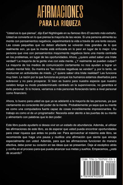 ¿Quiere usted 250 afirmaciones sobre la atracción de la riqueza? Este libro podría ser la respuesta que usted está buscando... "Usted es, y se convertirá, en lo que piensa", dijo Earl Nightingale en su famoso libro, El secreto más extraño. Usted se convierte en lo que piensa la mayor parte del tiempo. El objetivo de las Afirmaciones para la riqueza: 250 afirmaciones positivas sobre vivir en abundancia y atraer dinero es hacerle sentirse empoderado. Este libro puede ayudarle si desea vivir en un estado de abundancia. Además, al utilizar las afirmaciones de este libro, es de esperar que pueda encontrar oportunidades para crear riqueza donde antes no las podía ver. Este libro incluye: Un resumen sobre el uso efectivo de las afirmaciones. Cincuenta afirmaciones de gratitud. Cincuenta afirmaciones de abundancia. Cincuenta afirmaciones sobre la atracción del dinero. Cien afirmaciones de éxito y riqueza. ¡Obtenga este libro ahora para obtener más información acerca de las afirmaciones para la riqueza!
