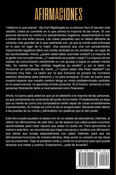 5 manuscritos completos en 1 libro • Afirmaciones para la riqueza: 250 afirmaciones positivas sobre vivir en abundancia y atraer dinero • Afirmaciones positivas: 250 afirmaciones diarias sobre cómo atraer el amor, ganar dinero, tener una vida saludable y encontrar la verdadera felicidad • Afirmaciones Diarias: 250 Afirmaciones Positivas Para la Salud, la Riqueza, la Felicidad y el Amor • Afirmaciones "Yo soy": 250 afirmaciones poderosas sobre vivir en abundancia de riqueza, salud, amor, creatividad, autoestima, alegría y felicidad • Afirmaciones para el éxito: 250 afirmaciones positivas para crear hábitos diarios poderosos y comenzar la mañana con una autoestima alta, ganar dinero y construir relaciones beneficiosas "Usted es, y se convertirá, en lo que piensa", dijo Earl Nightingale en su famoso libro, El secreto más extraño. Usted se convierte en lo que piensa la mayor parte del tiempo. El objetivo de las Afirmaciones para la riqueza: 250 afirmaciones positivas sobre vivir en abundancia y atraer dinero es hacerle sentirse empoderado. Este libro puede ayudarle si desea vivir en un estado de abundancia. Además, al utilizar las afirmaciones de este libro, es de esperar que pueda encontrar oportunidades para crear riqueza donde antes no las podía ver. La primera parte de este libro incluye: • Un resumen sobre el uso efectivo de las afirmaciones. • Cincuenta afirmaciones de gratitud. • Cincuenta afirmaciones de abundancia. • Cincuenta afirmaciones sobre la atracción del dinero. • Cien afirmaciones de éxito y riqueza. Al leer la segunda parte de este libro, usted: • Cómo utilizar las afirmaciones de forma efectiva • 50 afirmaciones del dinero • 50 afirmaciones del amor • 50 afirmaciones sobre la salud • 100 afirmaciones positivas sobre la felicidad, la alegría, la confianza y la gratitud Al leer la tercera parte de este libro, usted: • Cómo usar las afirmaciones: 10 reglas para crear afirmaciones perfectas • Afirmaciones de riqueza, abundancia y prosperidad • Afirmaciones para el amor • Afirmaciones para la salud • Afirmaciones para la felicidad Al leer las cuatro partes de este libro, usted: • La riqueza • La salud • El amor • La creatividad Al leer la quinta parte de este libro, usted: • Cómo aumentar la efectividad de las afirmaciones • Afirmaciones para la confianza en sí mismo • Afirmaciones para el éxito ¡Obtenga este libro ahora para obtener más in