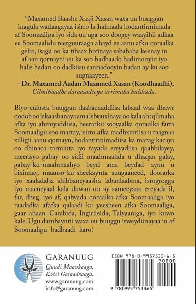 Biyo-culusta buuggan daabacaaddiisa labaad waa dhawr qodob oo iskaashanaya ama isbuuxinaya oo kala ah: qiimaha afka iyo ahmiyaddiisa, heerarkii sooyaalka qoraalka farta Soomaaligu soo martay, isirro afka madhxintiisa u taagnaa xilligii aanu qornayn, hodantinnimadiisa ka marag kacaya oo dhinaca tarminta iyo tayada ereyadiisa qaabbilayey, meerisyo gabay oo sidii maahmaahda u dhaqan galay, gabay-ku-maahmaahyo beyd ama beydad aynu u bixinnay, maanso-ku-sheekaynta suugaaneed, doorarka iyo xaaladaha shibbaneyaasha labanlaabma, isrogrogga iyo macneyaal kala duwan oo ay sameeyaan ereyada il, far, dheg, iyo af, qabyada qoraalka afka Soomaaliga iyo raadadka afafka qalaadi ku yeesheen afka Soomaaliga, gaar ahaan Carabida, Ingiriisida, Talyaaniga, iyo kuwo kale. Ugu dambayntii waxa uu buuggu isweydiinayaa in af Soomaaligu badbaadi karo!