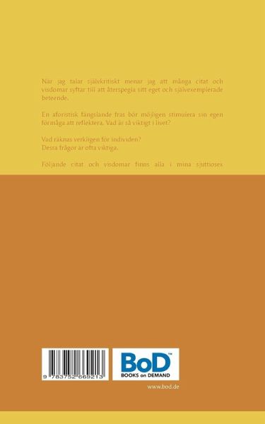 När jag talar självkritiskt menar jag att många citat och visdomar syftar till att återspegla sitt eget och självexemplerade beteende.En aforistisk fängslande fras bör möjligen stimulera sin egen förmåga att reflektera. Vad är så viktigt i livet?Vad räknas verkligen för individen?Dessa frågor är ofta viktiga.Följande citat och visdomar finns alla i mina sjuttiosex publicerade romaner.