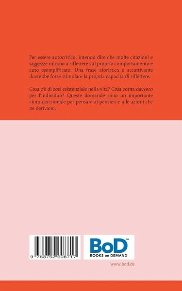 Per essere autocritico, intendo dire che molte citazioni e saggezze mirano a riflettere sul proprio comportamento e auto esemplificato. Una frase aforistica e accattivante dovrebbe forse stimolare la propria capacità di riflettere.Cosa c'è di così esistenziale nella vita? Cosa conta davvero per l'individuo? Queste domande sono un importante aiuto decisionale per pensare ai pensieri e alle azioni che ne derivano.Le seguenti citazioni e saggezze si possono trovare nei miei settantasei romanzi pubblicati.