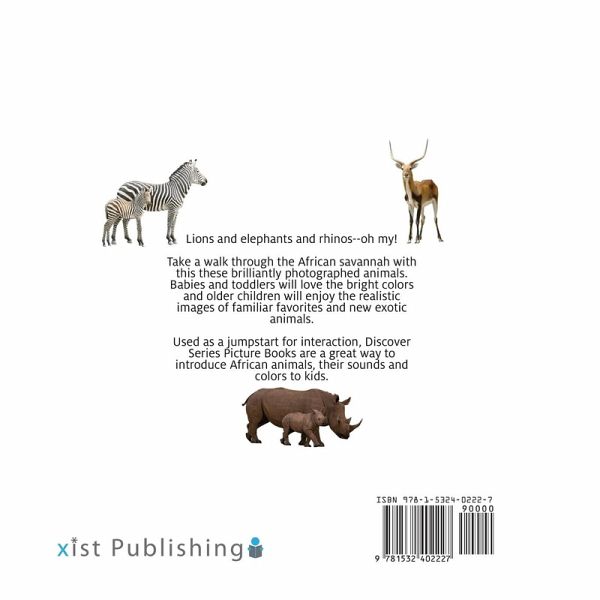 Lions and elephants and rhinos--oh my! Take a walk through the African savannah with this these brilliantly photographed animals. Designed without distractions for babies and toddlers--your little ones will love the bright colors, interesting animals and the chance to discover new things. Used as a jumpstart for interaction, Discover Series Picture Books are a great way to introduce African animals, their sounds and colors to kids. Leones y elefantes y rinocerontes - oh mi! Tome un paseo por la sabana africana con este estos animales fotografiados brillantemente. Diseñado sin distracciones para los bebés y los niños pequeños - sus pequeños les encantará los colores brillantes, animales interesantes y la oportunidad de descubrir cosas nuevas. Utilizado como un salto para la interacción, Discover Series Picture Books son una gran manera de introducir animales africanos, sus sonidos y colores a los niños. Discover series bilingual titles feature word picture association in both English and Spanish.
