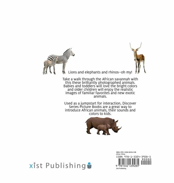 Lions and elephants and rhinos--oh my! Take a walk through the African savannah with this these brilliantly photographed animals. Designed without distractions for babies and toddlers--your little ones will love the bright colors, interesting animals and the chance to discover new things. Used as a jumpstart for interaction, Discover Series Picture Books are a great way to introduce African animals, their sounds and colors to kids. Leones y elefantes y rinocerontes - oh mi! Tome un paseo por la sabana africana con este estos animales fotografiados brillantemente. Diseñado sin distracciones para los bebés y los niños pequeños - sus pequeños les encantará los colores brillantes, animales interesantes y la oportunidad de descubrir cosas nuevas. Utilizado como un salto para la interacción, Discover Series Picture Books son una gran manera de introducir animales africanos, sus sonidos y colores a los niños. Discover series bilingual titles feature word picture association in both English and Spanish.