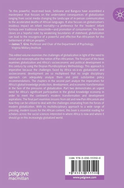 Part I: Diopian Pluridisciplinary Treatises on Globalization and Africa's Socioeconomic and Political Development in the 21st Century.- Chapter 1: Why It Is Okay for Africans to Be Who They Are in a Globalized World that Has Become Inhumane.- Chapter 2: The Effects of the Politics of Globalization on Politics in Africa: How African Countries Can Achieve Significant Political Stability and Equality in International Multilateral Political Institutions.- Chapter 3: Engeli yokulya oluwombo: Social Media and the Transformation of African and Black Diasporic Forms of Communication.- Chapter 4: Self-Governance, Political Uniformity and the Significance of Policy Alignment for Education and Training Programs.- Chapter 5: The Impact of Globalization on African Languages and Linguistics: A Systematic Analysis Using the Theorem of Accelerated Language Deaths.- Part II: Global Knowledge Production, Development, and Economic Transformation in the Era of Globalization.-Chapter 6: Re-Africanizing Breast Feeding as Africa's Gift to Global Health in this Era of Globalization.- Chapter 7: The Challenges of the Increasing Consumerism in Africa in the Era of Globalization: A Systematic Analysis Employing Consumerism Theory.- Chapter 8: The Continuing Impact of HIV/AIDS on Development in Africa: A Systematic Analysis Using the Political Systems and Contagious Disease Theories.- Chapter 9: The Impact of the World Bank and International Monetary Fund on African Sustainability and Growth in the Era of Globalization.- Chapter 10: Combining Rehk Methodology and Cheikh Anta Diop's Postulates as a Systematic Approach for Assessing the Substantiveness of Indigenous Knowledge Production Systems in Africa.- Part III: Lessons from Old and New Pan-Africanism for Dealing with the Challenges of Globalization in Africa.- Chapter 11: Old and New Pan-Africanism vis-à-vis Regional Integration: Lessons for Dealing with the Challenges of Globalization.- Chapter 12:Pan-Africanism and Regional Integration in Africa in the Era of Globalization: A Systematic Analysis Utilizing Consciencist Methodology.- Chapter 13: Lessons from Martin Robinson Delany's Tenets on Pan-Africanism and How They Can Be Employed to Combat the Encroachment of Globalization in Africa.- Chapter 14: Hrara/S-tut/Qe : Re-conceptualizing Pan-African Studies in the Era of Globalization Using a Mixture of Ancient Egyptian, Diopian, Mazruiana, Mbitian, and Asanteian Perspectives.