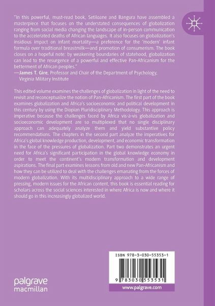 Part I: Diopian Pluridisciplinary Treatises on Globalization and Africa's Socioeconomic and Political Development in the 21st Century.- Chapter 1: Why It Is Okay for Africans to Be Who They Are in a Globalized World that Has Become Inhumane.- Chapter 2: The Effects of the Politics of Globalization on Politics in Africa: How African Countries Can Achieve Significant Political Stability and Equality in International Multilateral Political Institutions.- Chapter 3: Engeli yokulya oluwombo: Social Media and the Transformation of African and Black Diasporic Forms of Communication.- Chapter 4: Self-Governance, Political Uniformity and the Significance of Policy Alignment for Education and Training Programs.- Chapter 5: The Impact of Globalization on African Languages and Linguistics: A Systematic Analysis Using the Theorem of Accelerated Language Deaths.- Part II: Global Knowledge Production, Development, and Economic Transformation in the Era of Globalization.-Chapter 6: Re-Africanizing Breast Feeding as Africa's Gift to Global Health in this Era of Globalization.- Chapter 7: The Challenges of the Increasing Consumerism in Africa in the Era of Globalization: A Systematic Analysis Employing Consumerism Theory.- Chapter 8: The Continuing Impact of HIV/AIDS on Development in Africa: A Systematic Analysis Using the Political Systems and Contagious Disease Theories.- Chapter 9: The Impact of the World Bank and International Monetary Fund on African Sustainability and Growth in the Era of Globalization.- Chapter 10: Combining Rehk Methodology and Cheikh Anta Diop's Postulates as a Systematic Approach for Assessing the Substantiveness of Indigenous Knowledge Production Systems in Africa.- Part III: Lessons from Old and New Pan-Africanism for Dealing with the Challenges of Globalization in Africa.- Chapter 11: Old and New Pan-Africanism vis-à-vis Regional Integration: Lessons for Dealing with the Challenges of Globalization.- Chapter 12:Pan-Africanism and Regional Integration in Africa in the Era of Globalization: A Systematic Analysis Utilizing Consciencist Methodology.- Chapter 13: Lessons from Martin Robinson Delany's Tenets on Pan-Africanism and How They Can Be Employed to Combat the Encroachment of Globalization in Africa.- Chapter 14: Hrara/S-tut/Qe : Re-conceptualizing Pan-African Studies in the Era of Globalization Using a Mixture of Ancient Egyptian, Diopian, Mazruiana, Mbitian, and Asanteian Perspectives.