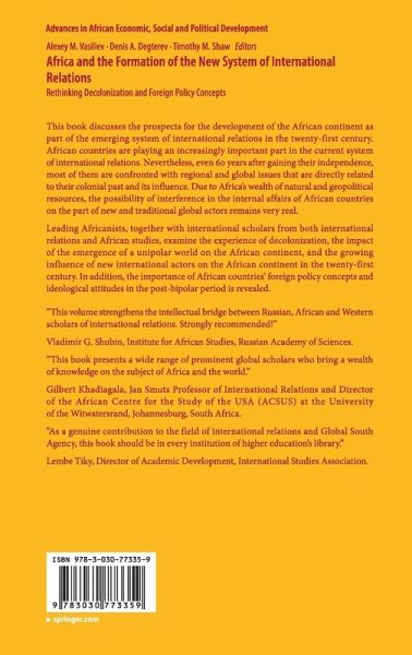 This book discusses the prospects for the development of the African continent as part of the emerging system of international relations in the twenty-first century. African countries are playing an increasingly important part in the current system of international relations. Nevertheless, even 60 years after gaining their independence, most of them are confronted with regional and global issues that are directly related to their colonial past and its influence. Due to Africa's wealth of natural and geopolitical resources, the possibility of interference in the internal affairs of African countries on the part of new and traditional global actors remains very real.