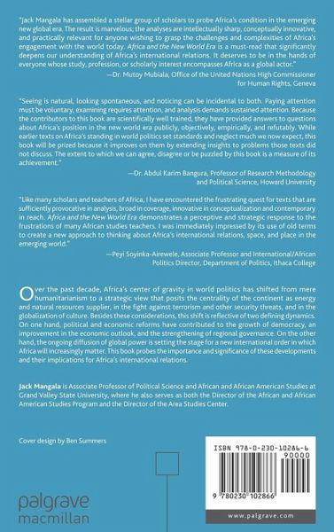 Africa and the New World Era: Context and Stakes; J.Mangala PART I: AFRICA AND THE OLD BALANCE OF POWER Imperialism and US-Africa Relations; G.Kieh Britain and Africa in the Twenty-First Century; P.Williams Is France Disengaging from Africa? A Critical Look at Nicolas Sarkozy's 'Rupture' Policy in the Context of France-Africa Relations; D.Mengara Back to Africa: Russia's New African Engagement; P.Pham PART II: AFRICA AND THE NEW BALANCE OF POWER Africa's International China relations: Contending Imaginairies and Changing Politics; D.Large Japan in Africa: Diplomacy of Continuity and Change; S.Adem India's New Engagement of Africa: Trends and Implications; P.Pham Latin America-Africa Cooperation: Brazil as a Case Study; G.Lechini PART III: AFRICA IN GLOBAL AND REGIONAL GOVERNANCE The Evolving Africa-UN Relationships since the End of the Cold War; A.Bariagaber The World Bank for Africa, or the World Bank for the World Bank?; P.Clements The European Union and Africa: Old Partners in a Changing World; J.Mangala The African Union as International Actor; T.Murithi PART IV: CONFRONTING AFRICA'S DEVELOPMENT New Encounters in US-Africa Democracy Relations: Less of the Same?; R.K.Edozie U.S. AIDS Policy in Africa: Balancing Competing Interests in PEPFAR Policy-Making; P.Diven The Impact of the Global Economic Crisis on Africa; K.Quartey Can Sub-Saharan Africa achieve the Millennium Development Goals?; E.Cleeve