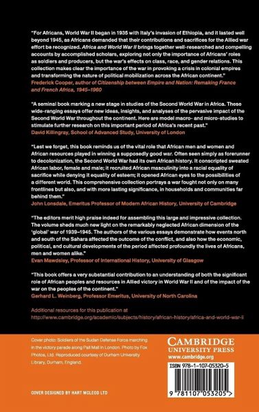 This volume considers the military, economic, and political significance of Africa during World War II. The essays feature new research and innovative approaches to the historiography of Africa and bring to the fore issues of race, gender, and labor during the war, topics that have not yet received much critical attention. It explores the experiences of male and female combatants, peasant producers, women traders, missionaries, and sex workers. The first section offers three introductory essays that give a continent-wide overview of how Africa sustained the Allied effort through labor and resources. The six sections that follow offer individual case studies from different parts of the continent. Contributors offer a macro and micro view of the multiple levels on which Africa's contributions shaped the war as well as the ways in which the war affected individuals and communities and transformed Africa's political, economic, and social landscape.