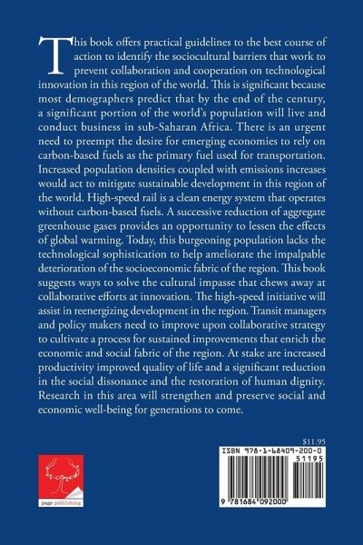 This book offers practical guidelines to the best course of action to identify the sociocultural barriers that work to prevent collaboration and cooperation on technological innovation in this region of the world. This is significant because most demographers predict that by the end of the century, a significant portion of the world's population will live and conduct business in sub-Saharan Africa. There is an urgent need to preempt the desire for emerging economies to rely on carbon-based fuels as the primary fuel used for transportation. Increased population densities coupled with emissions increases would act to mitigate sustainable development in this region of the world. High-speed rail is a clean energy system that operates without carbon-based fuels. A successive reduction of aggregate greenhouse gases provides an opportunity to lessen the effects of global warming. Today, this burgeoning population lacks the technological sophistication to help ameliorate the impalpable deterioration of the socioeconomic fabric of the region. This book suggests ways to solve the cultural impasse that chews away at collaborative efforts at innovation. The high-speed initiative will assist in reenergizing development in the region. Transit managers and policy makers need to improve upon collaborative strategy to cultivate a process for sustained improvements that enrich the economic and social fabric of the region. At stake are increased productivity improved quality of life and a significant reduction in the social dissonance and the restoration of human dignity. Research in this area will strengthen and preserve social and economic well-being for generations to come.
