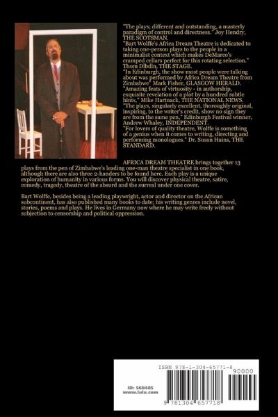 Well recognised as the leading light in one-man shows in Zimbabwe, here is a collection of the majority of Bart Wolffe's published works for the stage including three two-handers, a thrilling mix of thirteen dramatic pieces with male and female parts that all have a common quality: an intimate exploration of the human condition in the most unique assembly of characters for performance you could possibly ever meet. They are all plays designed to travel, without much fuss, low-cost productions with maximum impact, in comedy and drama, satires and absurdist theatre pieces, physical theatre also; these plays have been performed throughout Southern Africa and in London, Edinburgh and Dublin, used for masterclasses and workshops, for festivals and for main stage venues right through to intimate and private performances in people's homes.