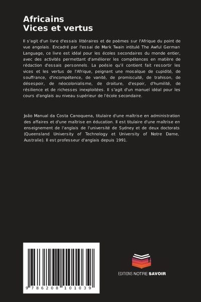 Il s'agit d'un livre d'essais littéraires et de poèmes sur l'Afrique du point de vue angolais. Encadré par l'essai de Mark Twain intitulé The Awful German Language, ce livre est idéal pour les écoles secondaires du monde entier, avec des activités permettant d'améliorer les compétences en matière de rédaction d'essais personnels. La poésie qu'il contient fait ressortir les vices et les vertus de l'Afrique, peignant une mosaïque de cupidité, de souffrance, d'incompétence, de vanité, de promiscuité, de trahison, de désespoir, de néocolonialisme, de droiture, d'espoir, d'humilité, de résilience et de richesses inexploitées. Il s'agit d'un manuel idéal pour les cours d'anglais au niveau supérieur de l'école secondaire.