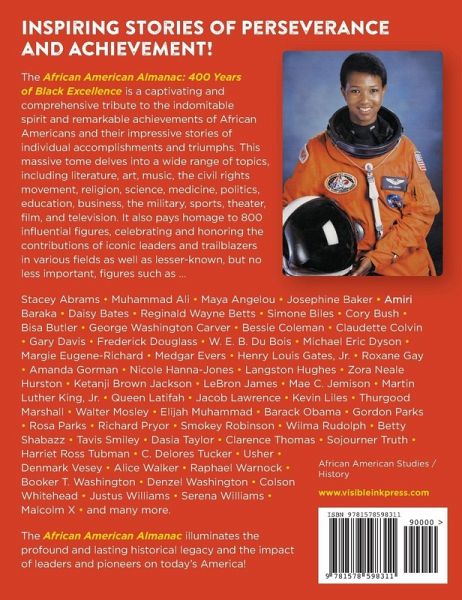 Courage, resilience and triumph! Celebrating the African American experience, the extraordinary people, and their profound influence on American history! African Americans helped build the United States. Their contributions, deeds, and influence are interwoven into the fabric of the country. Celebrating centuries of achievements, the African American Almanac: 400 Years of Black Excellence provides insights on the impact and inspiration of African Americans on U.S. society and culture spanning centuries and presented in a fascinating mix of biographies, historical facts, and enlightening essays on significant legislation and movements. Covering events surrounding African American literature, art and music; the civil rights movement; religion within the black community; advances in science and medicine; and politics, education, business, the military, sports, theater, film, and television, this important reference connects history to the issues currently facing the African American community. The African American Almanac also honors the lives and contributions of 800 influential figures, including ... Stacey Abrams, Muhammad Ali, Maya Angelou, Josephine Baker, Amiri Baraka, Daisy Bates, Reginald Wayne Betts, Simone Biles, Cory Bush, Bisa Butler, George Washington Carver, Ray Charles, Bessie Coleman, Claudette Colvin, Gary Davis, Frederick Douglass, W. E. B. Du Bois, Michael Eric Dyson, Duke Ellington, Margie Eugene-Richard, Medgar Evers, Henry Louis Gates, Jr., Roxane Gay, Amanda Gorman, Nicole Hanna-Jones, Eric H. Holder, Jr., Langston Hughes, Zora Neale Hurston, Ketanji Brown Jackson, LeBron James, Mae C. Jemison, Gayle King, Martin Luther King, Jr., Queen Latifah, Jacob Lawrence, Kevin Liles, Thurgood Marshall, Walter Mosley, Elijah Muhammad, Barack Obama, Gordon Parks, Rosa Parks, Richard Pryor, Condoleezza Rice, Smokey Robinson, Wilma Rudolph, Betty Shabazz, Tavis Smiley, Dasia Taylor, Clarence Thomas, Sojourner Truth, Harriet Ross Tubman, C. Delores Tucker, Usher, Denmark Vesey, Alice Walker, Raphael Warnock, Booker T. Washington, Denzel Washington, Cornell West, Colson Whitehead, Justus Williams, Serena Williams, Oprah Winfrey, Malcolm X, and many more. Completely updated and revised for the first time in over a decade, the African American Almanac looks at the recent challenges-from the Black Lives Movement to Covid-19?and ongoing resilience of our nation, and it shines a light on our momentous and complicated history, the individual accomplishments and contributions of the celebrated and unsung?but no less worthy?people who built our country and who continue to influence American society. Comprehensive and richly illustrated, it thoroughly explores the past, progress, and current conditions of America. This seminal work is the most complete and affordable single-volume reference of African American culture and history available today, and it illustrates and demystifies the emotionally moving, complex, and often lost history of black life in America!