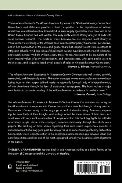 The African-American Experience in Nineteenth-Century Connecticut examines and analyzes the African-American experience in Connecticut as it was through primary sources. Theresa Vara-Dannen analyzes the language of real nineteenth-century Americans expressing the complexity of their thoughts and feelings about the racial issues of their times in a small state with very small communities of people of color. This book highlights the attitudes of ordinary people whose voices emerged, sometimes heroically, through their daily newspapers. The meshing of these voices regarding their race-related experiences provides a nuanced account of a long-gone past, but also gives us an understanding of twenty-first-century Connecticut, which leads the nation in the educational and economic gap between urban and nonurban citizens and has one of the most segregated school systems and residential patterns in the nation.
